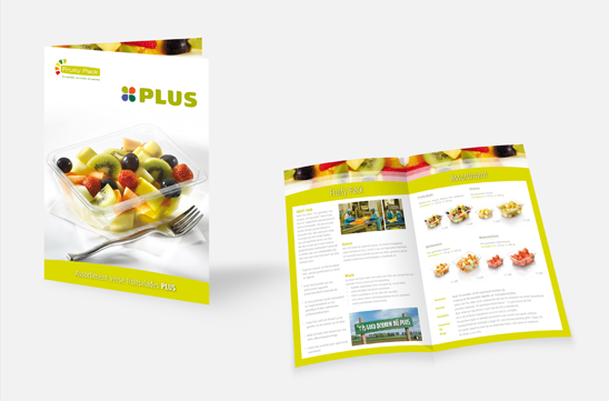 Een flyer van Fruity Pack over hun vers gesneden fruit voor de Plus supermarkt.