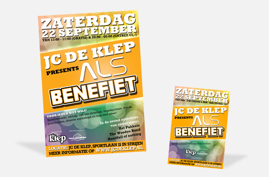 Een poster & flyer voor een benefiet festival georganiseerd door jongeren- centrum de Klep in Strijen waar ik tevens ook vrijwilliger ben. Met dit festival hebben we €3.242,92 opgehaald voor Stichting ALS Nederland.